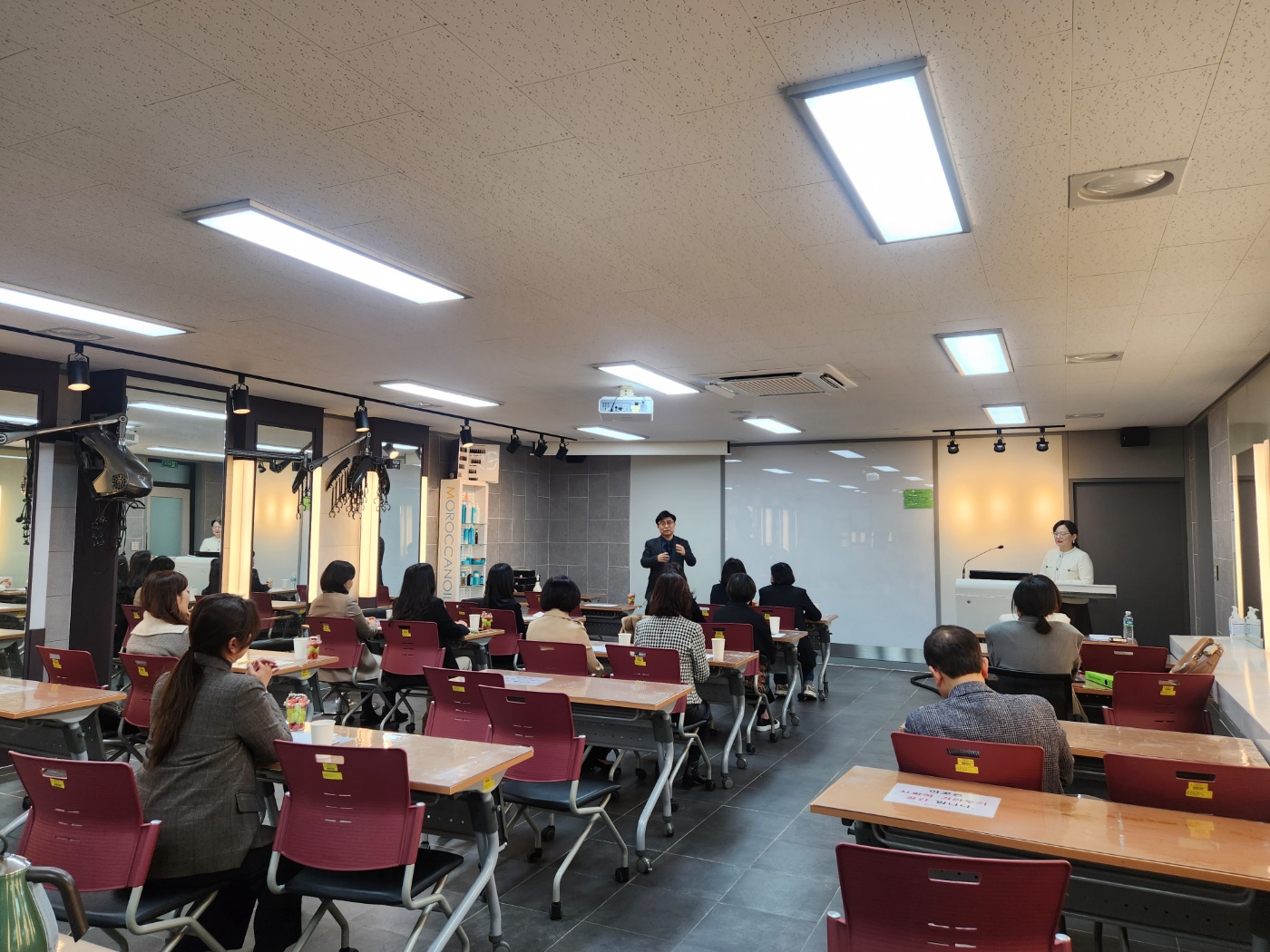 ○ 박정수 학과장님 학사 일정과 공지 사항들에 대한 설명과 함께 헤어, 피부, 네일, 메이크업 교수님들의 인사말씀 그리고 주간과 야간 교수님들의 소개로 진행이 되었다.