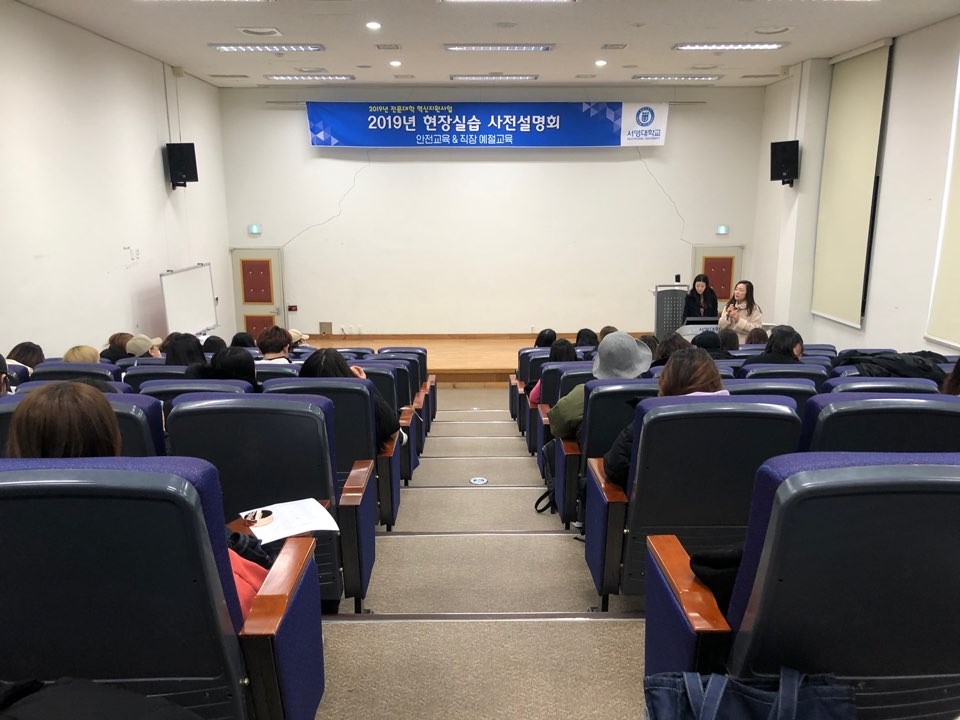 [2019년 전문대학 혁신지원사업] - 2019년 보육실습 사전설명회 - *일시: 2019년 12월 11일 (수) *강사: 아이플러스 부모교육연구소 최정희연구원 *대상: 유아교육과 재학생 2학년 *장소: 서영홀 *내용: 안전교육과 직장 예절교육을 통해 예비 영·유아 교사로서의 보육실습이 원만한 실습으로 이루어질 수 있도록 이에 대한 지침을 상세히 안내받았다. 또한, 실습생이 지녀야할 태도를 갖추고 실습에 대한 궁금증을 해결할 수 있는 시간이 마련되어 보육실습에 대한 두려움을 극복하였다.
