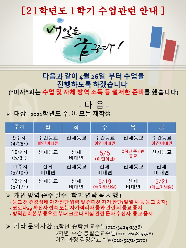 1. 코로나 -19 방역관리 준수사항에 따른 개인 건강관리 철저 2. 코로나-19 관련 증상 의심, 관련자 접촉에 따른 중대본 문자 수령자 또는 개인별 자가진단에 따른 컨디션이 않좋은 경우 등교중지 후 학과 연락 필수 ! 3. 상기 사항에 해당하지 않는 경우 결석에 따른 성적 및 출석률 불 이익 사전 공지. 4. 상기 사항 및 공적 업무와 결석 인정 범위를 벗어나 중간고사 과제물 미 제출 또는 미 응시 발생되는 불 이익 사전 공지.