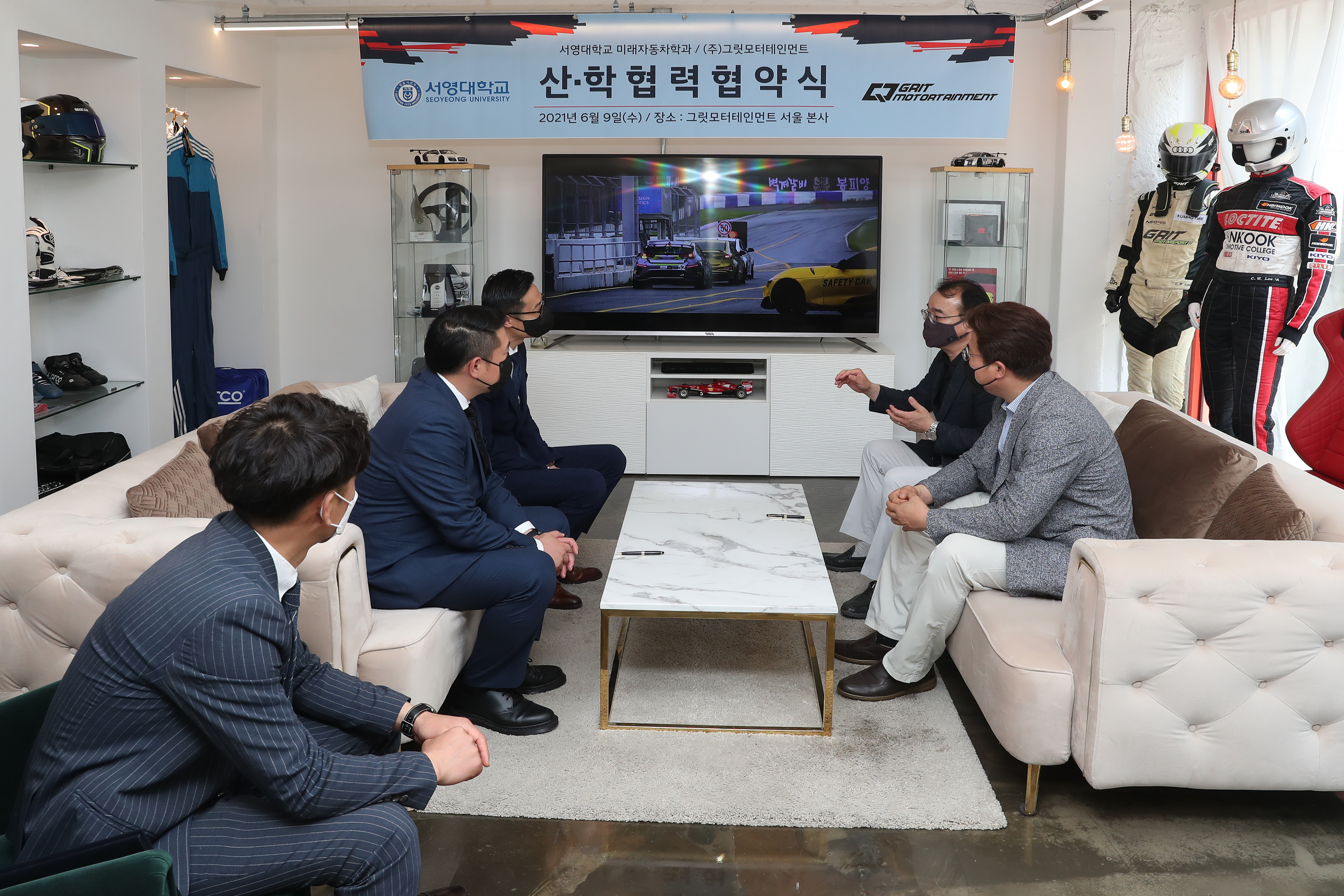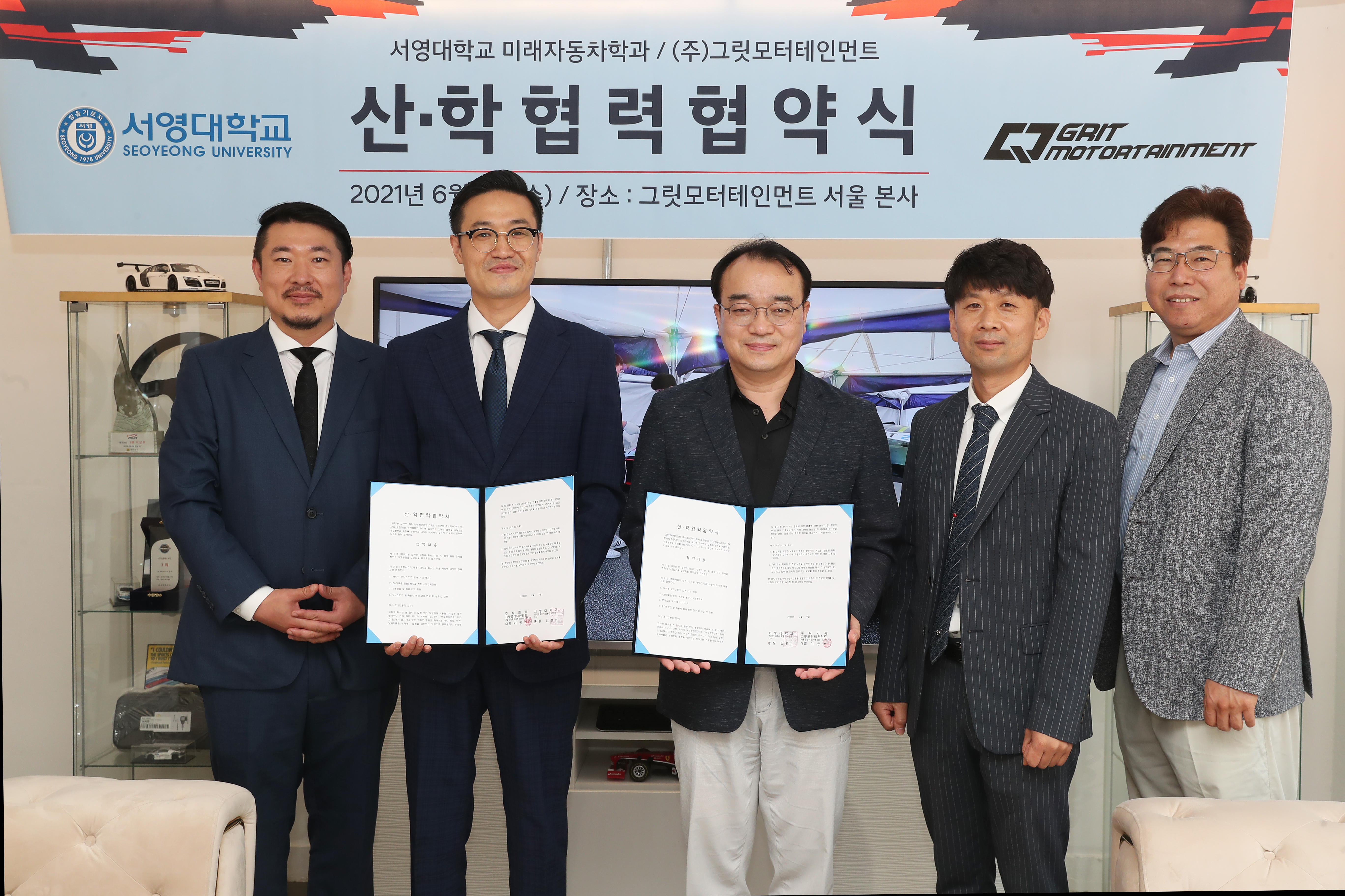 2021년 06월09일 서영대학교 미래자동차과와 그릿모터스포츠팀과 MOU를 체결하였습니다. 협약내용으로는 재학생 모터스포츠 참여 기회 제공, CEO(혹은 팀원)특강을 통한 산학인력교류, 현장실습 및 취업 기회지원, 모터스포츠 및 자동차튜닝 공동 연구 및 상호 간 교류 입니다. 이렇게 다양한 산업체 및 기업과 MOU를 통하여 재학생 및 졸업생분들에게 다양한 역량강화 기회제공, 많은 체험기회 등을 통하여 학훈인 재밋게 놀고, 재밋게 공부하자를 매일매일 실현하는 학과가 되겠습니다! MOU를 통해 재학생들에게 더 좋은 길을 열어주신 그릿모터테인먼트에게 감사드립니다~